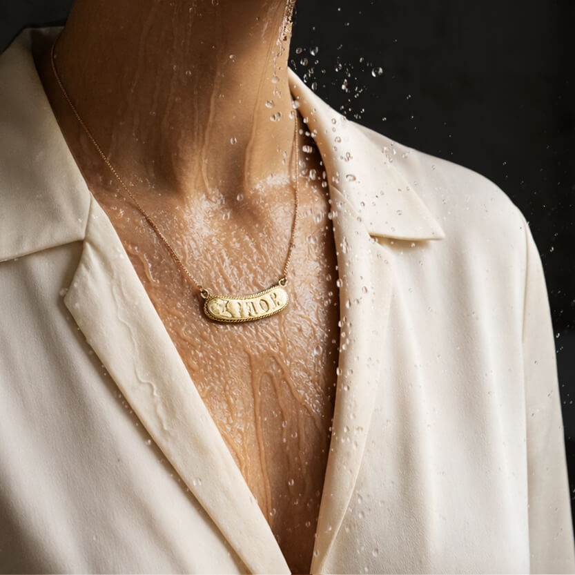 The collection includes custom name pendants, initial necklaces, fingerprint jewelry, and modular pieces that symbolize connection. Some designs come in pairs, complementary pendants that join together, perfect for representing bonds between family, partners, or personal milestones. Others are stand-alone emblems: understated but powerful, made to be worn daily and felt rather than displayed. Each piece is sculpted for body-conscious wear and everyday presence, becoming part of how you move and express yourself.